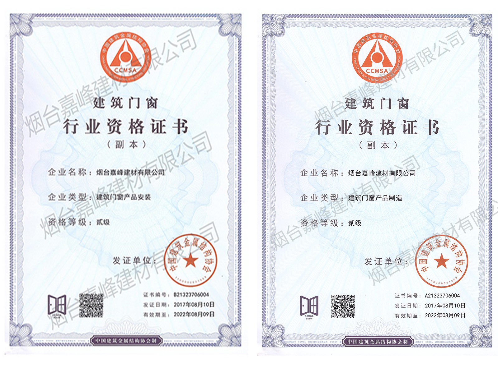 取得山東省新型墻材節能技術產品認定證書、國家二級建筑門窗產品制造和安裝資格證書